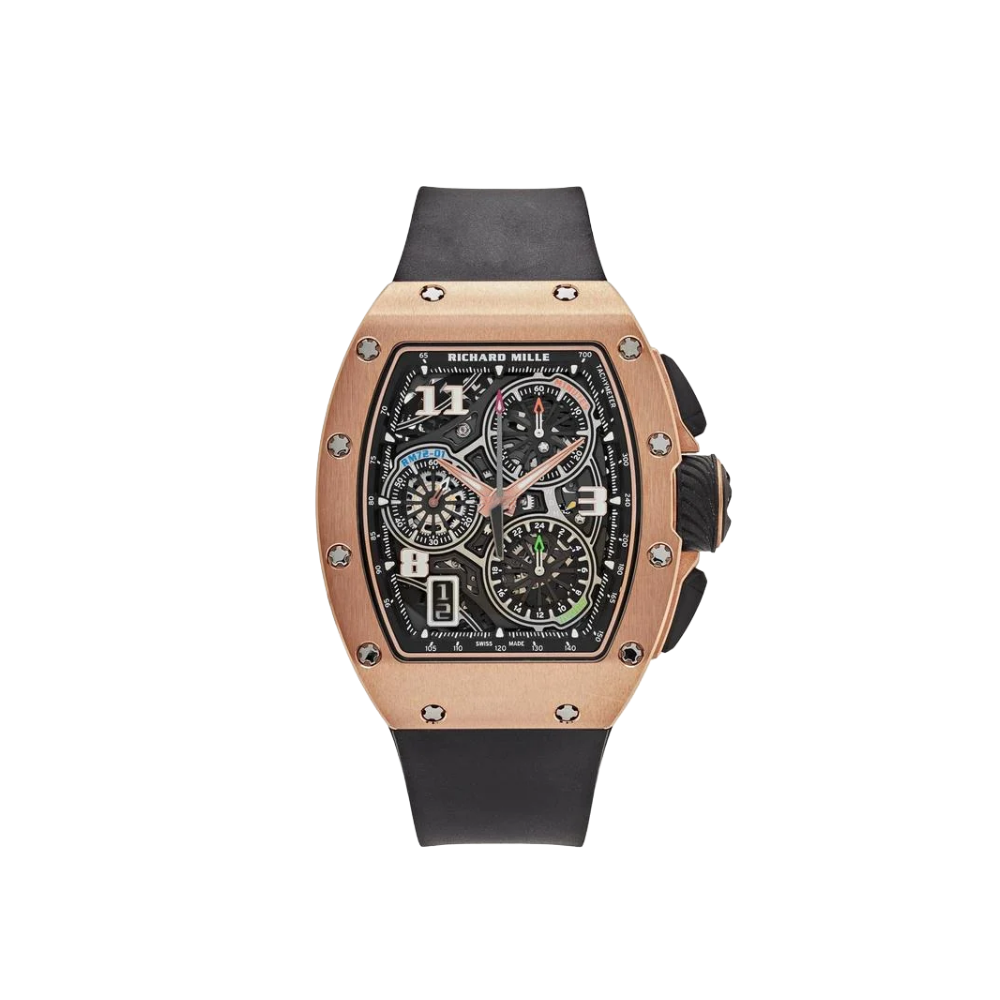 The Richard Mille RM 72-01 Lifestyle Chronograph in Rose Gold is a striking blend of technical innovation and luxurious design. Crafted from 18k rose gold, the tonneau-shaped case measures 38.40mm x 47.34mm and features Richard Mille’s signature mix of polished and satin-brushed finishes, embodying a bold yet sophisticated aesthetic.
